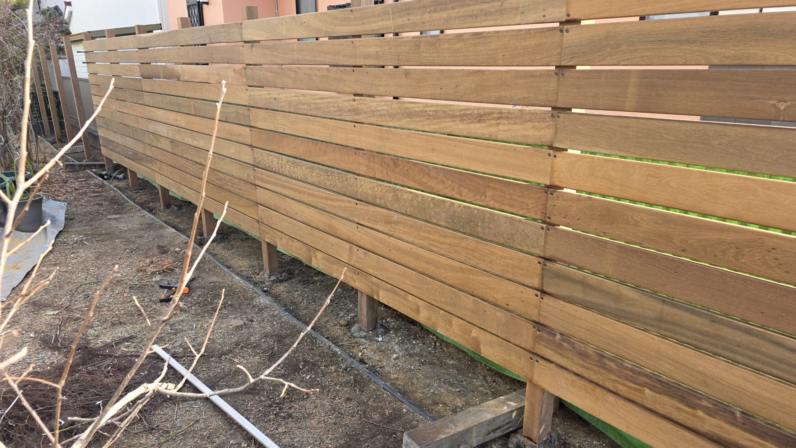 こんにちは。今日の投稿はこの前の続き、ウッドフェンスになります。前回の投稿を見ていない方はぜひ見て下さいね🍀😌🍀。今回は横板の作業になります。出来上がってくると、ワクワクしますね!