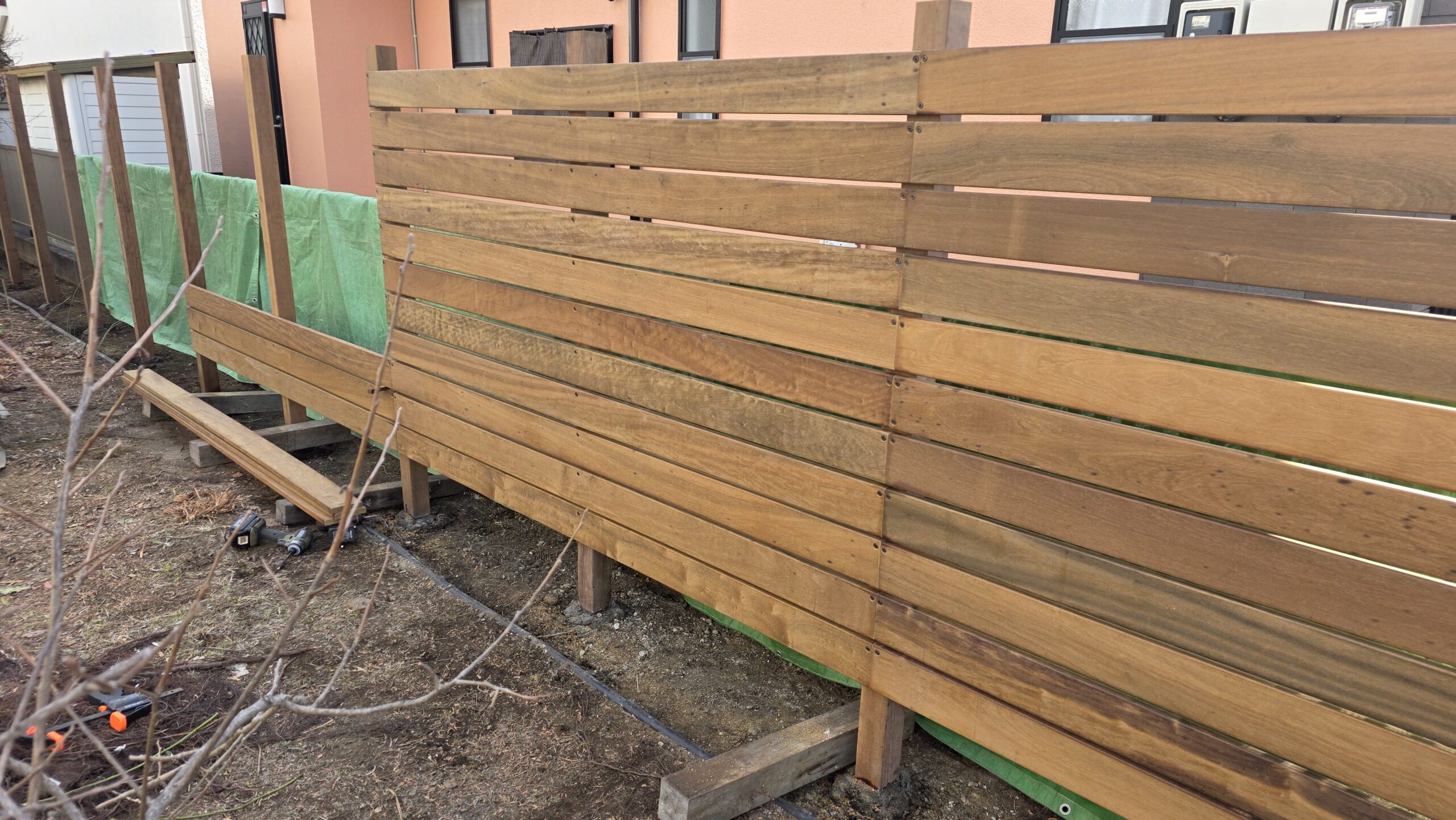 こんにちは。今日の投稿はこの前の続き、ウッドフェンスになります。前回の投稿を見ていない方はぜひ見て下さいね🍀😌🍀。今回は横板の作業になります。出来上がってくると、ワクワクしますね!
