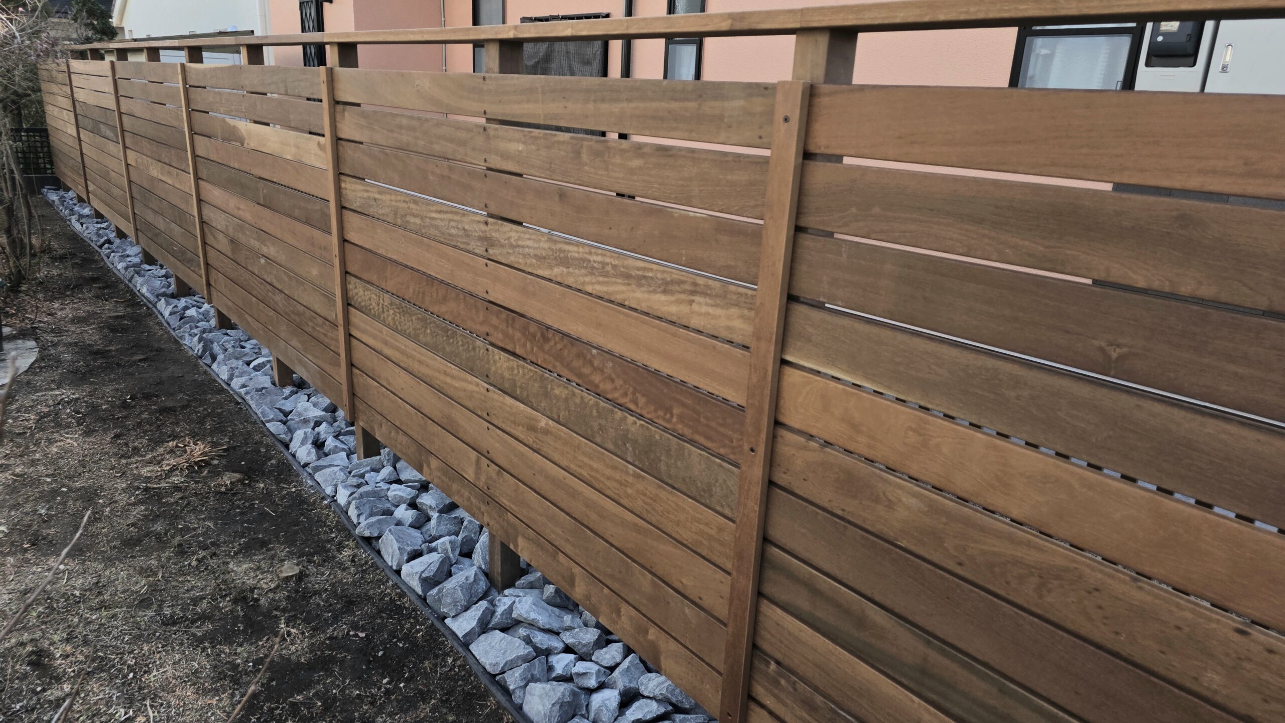 こんにちは。今日はウッドフェンス完成写真の投稿になります。前回の施工中を見てない方は見て下さいね🍀😌🍀。東京都町田市のお客様から道路からの目隠しをして欲しいとの事でしたので今回はウッドフェンスをおすすめさせてもらいました。材料はイタウバ材です。長さ13m、高さは1m60㎝。高さはお客様の好みに合わせて作らせてもらってますよ~✨。ウッドフェンスってあたたかみが有って好きなんですよね。それに植木を引き立ててくれるのでおすすめですよ!!施工後